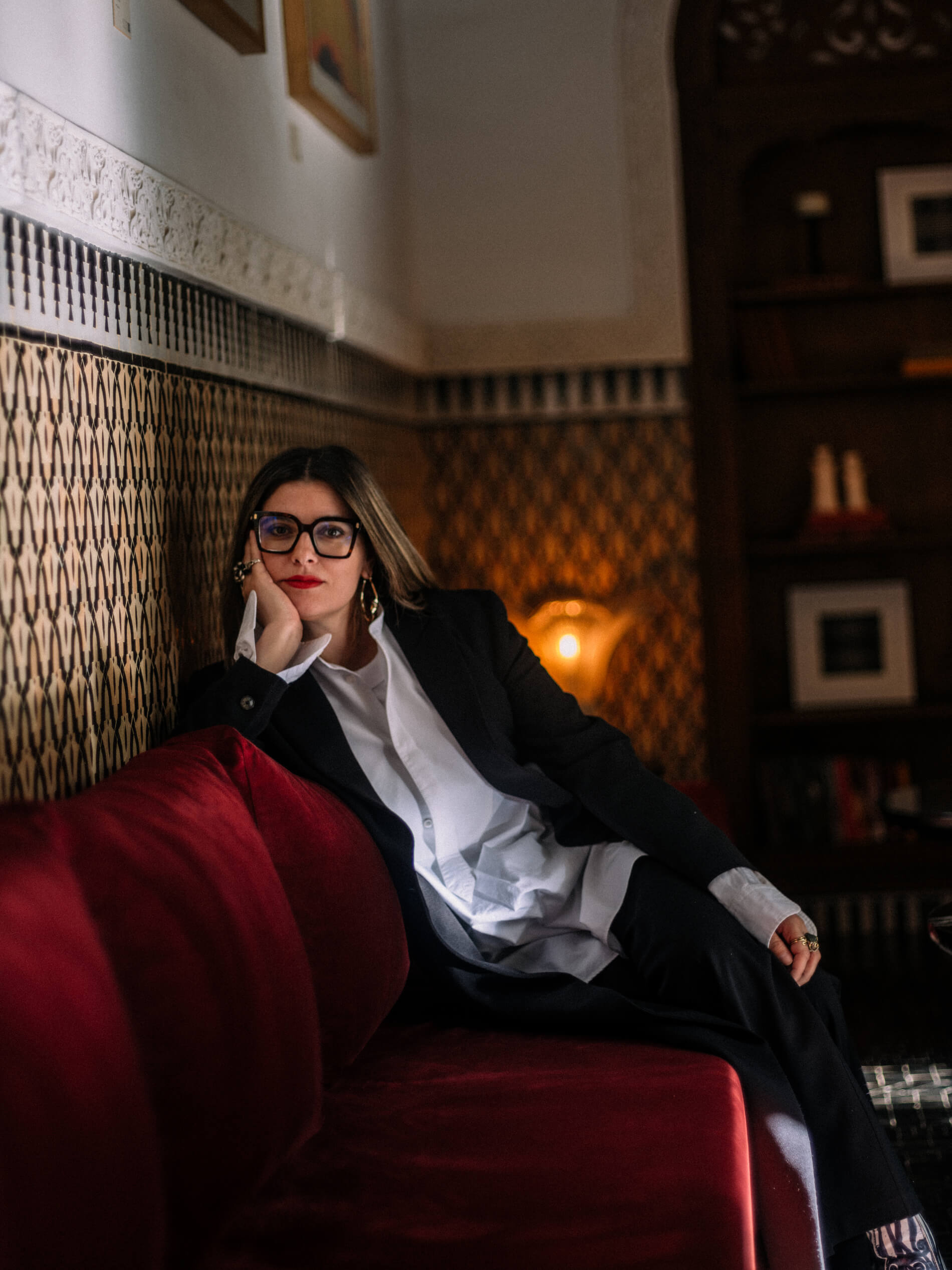The interior of IZZA operates on what Aisha calls layers of stories. This phrase is central to everything she does and everything the hotel is. There is the story of the architecture itself, the seven ancient houses and what they were before they became one. There is the story of the mid century furniture, each piece sourced individually, each one carrying its own provenance and its own decades of use. There is the story of the art collection: more than three hundred works, including pieces from Leila Alaoui's arresting Les Marocains series that hang in the reception lobby, generative digital art by Tyler Hobbs and Refik Anadol, and photography by Sebastião Salgado. And there is the story of Bill Willis himself, which lives most vividly in a room on the first floor called Bill Willis's Bar.