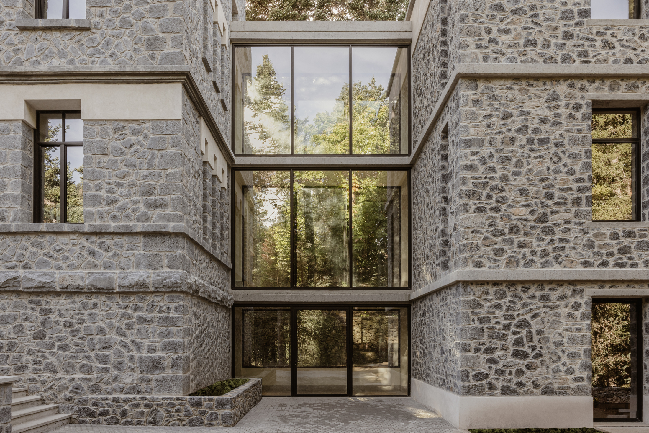 Manna offers 32 individually designed rooms, including six suites, spread across the main building and a rebuilt northern wing. The rooms do not try to impress you in the first thirty seconds. They do not need to. The power comes from proportion, material quality, and how light moves through the space, not from feature walls or statement pieces. Stone walls anchor everything. Chestnut timber warms the atmosphere without softening it. Terrazzo floors inlaid with marble patterns stay cool in summer and work quietly with underfloor heating in winter. The furniture is entirely bespoke, designed specifically for Manna by local craftspeople and handmade to support the architecture instead of competing with it. Colours are pulled directly from the Arcadian landscape: charcoal, moss, ash, mineral white. The layouts follow the sanatorium's original logic. Long, linear, balanced. High ceilings preserved from the original structure. Nothing oversized. Nothing trying too hard. Bathrooms are integrated into the room rather than hidden behind doors, with rain showers and basins carved from local stone. Suites feature freestanding copper soaking tubs positioned to frame forest and mountain views. Lighting is warm but controlled, avoiding the staged glow that makes most resort rooms feel like theatre sets.